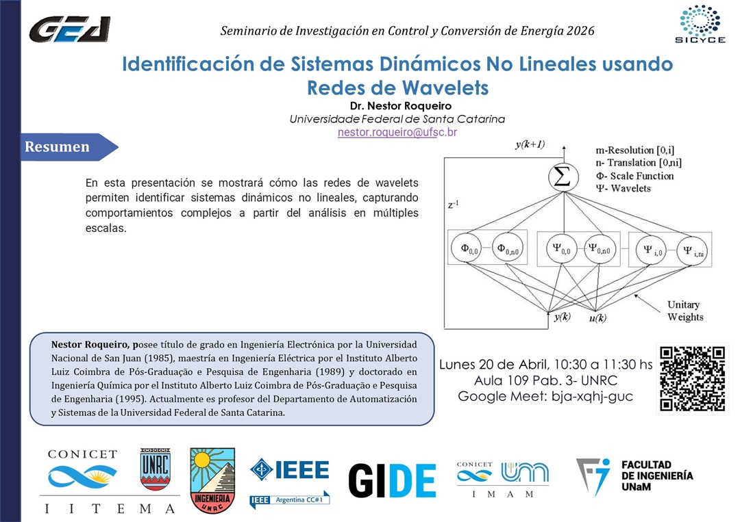 El encuentro, titulado “Identificación de Sistemas Dinámicos No Lineales usando Redes de Wavelets”, será dictado por el Dr. Néstor Roqueiro, profesor del Departamento de Automatización y Sistemas de la Universidade Federal de Santa Catarina (Brasil).